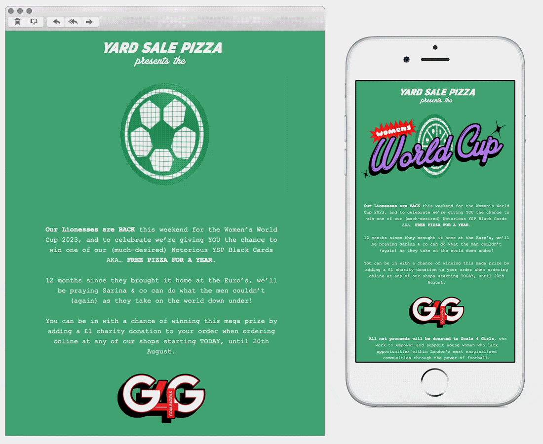 The Lionesses may not have brought the cup home (this time) but support of the incredible England team in the Women’s World Cup is something we LOVE to see. Yard Sale were ahead of the game, all over it before the tournament had even kicked off. The email not only encourages donations to a relevant cause but also offers some super cool prizes. And we’re very into the rotating football/pizza icon. Nice one Yard Sale, back of the net!