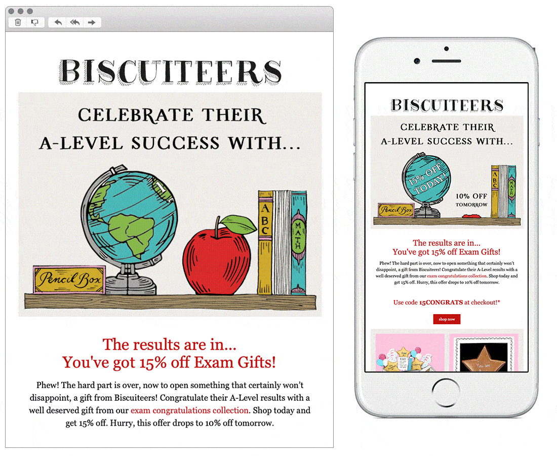 It’s lovely to see a nod to exam results season, with the timely content urging swift action based on an offer that reduces in value after just a day. And the hero and footer of this email are both really fun, we especially love the hand-drawn school style of the animated image in the header. So Biscuiteers, it’s an A* from us. Or…it would be, if that was still how exams were graded (showing our age much?!).