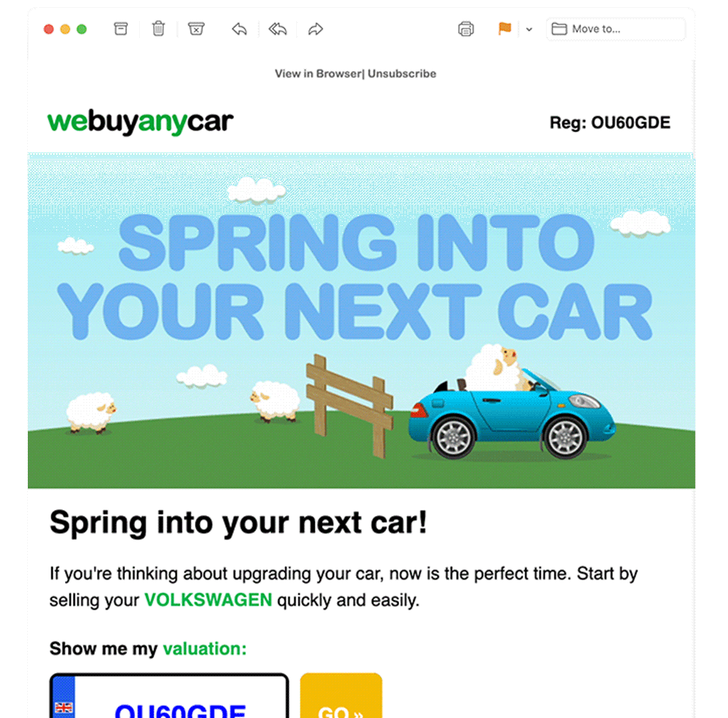 Their emails follow the website’s branding and are simple yet effective, with fun animation and direct copy that’s universally relatable and always with a reminder to follow up on your inquiry that was made into - you guessed it - selling your car.