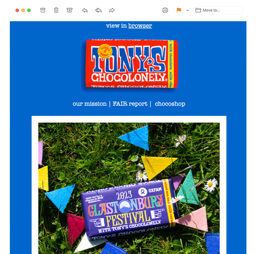 Their email marketing is definitely light-touch, with emails only dropping in if they have something to promote or around a major calendar event. But they are delightful to read, and we like the way that they always feature links to ‘our mission’ and ‘FAIR report’ in the hero, highlighting that they’re a mission-led organisation as they strive to make the chocolate supply chain 100% slave-free.