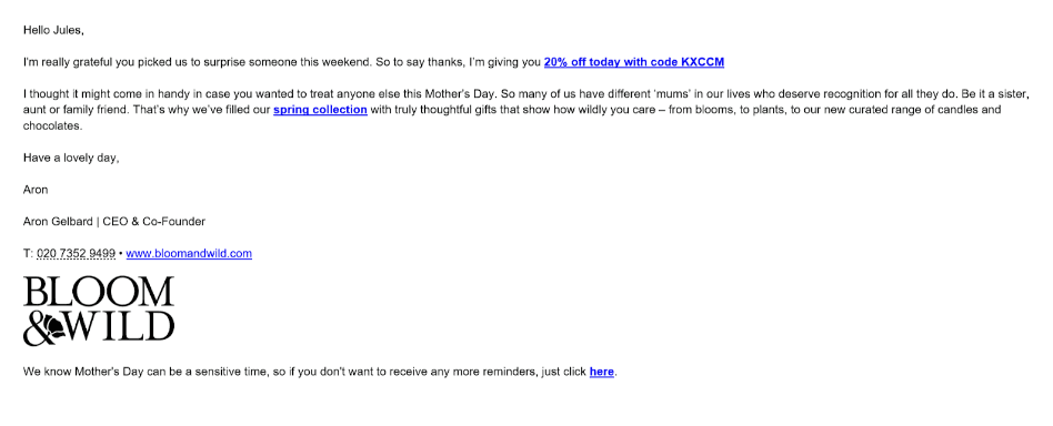 The email marketing from Bloom & Wild is impressive. A steady flow of newsletters drop in, often with temptingly good limited discount offers as well as clever personalisation when relevant. They also send letter-style emails that appear to have been personally sent by someone from the company; a great way to make their customer feel more connected with the brand.
