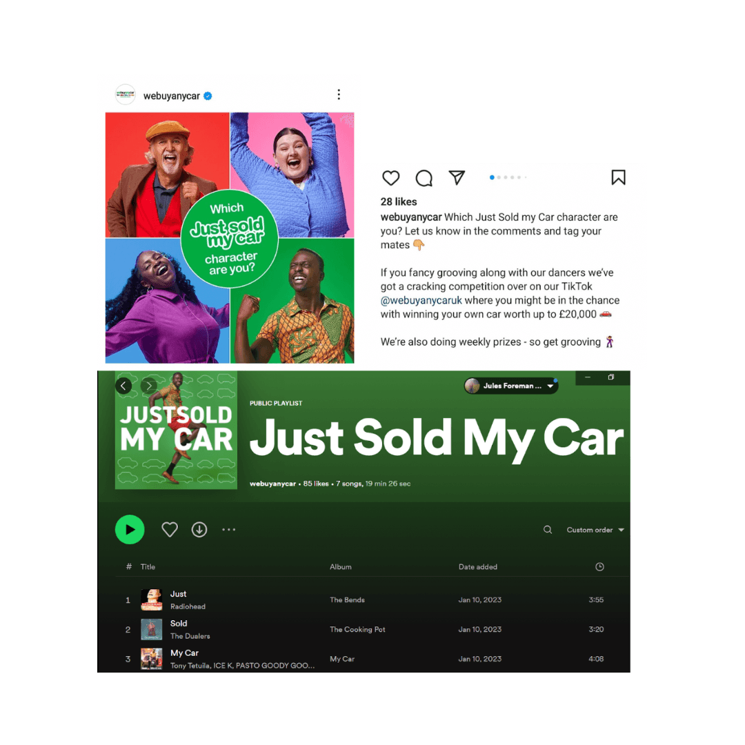 There’s no denying that they’ve always had a catchy TV/radio ad theme tune. But they recently seem to have upped their cross-channel marketing game too, kicking off with the fun Just Sold My Car TV ad which stars TikTok sensation Mufasa from the viral Friday Dance video. They’ve continued the campaign on their socials, with characters performing their own Just Sold My Car dance, as well as related competitions, audience participation opportunities and even a Spotify playlist.