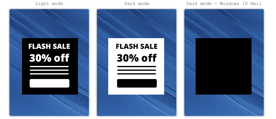 Finally, in some email clients it is possible to detect if dark mode is enabled, and use a media query to swap the image source to an alternative image for these recipients. This is not supported everywhere, and it will still be necessary to consider how the image will appear for dark mode users on platforms that do not recognise the media query. Here we explain how to swap images for dark mode, or take a look at our example below: