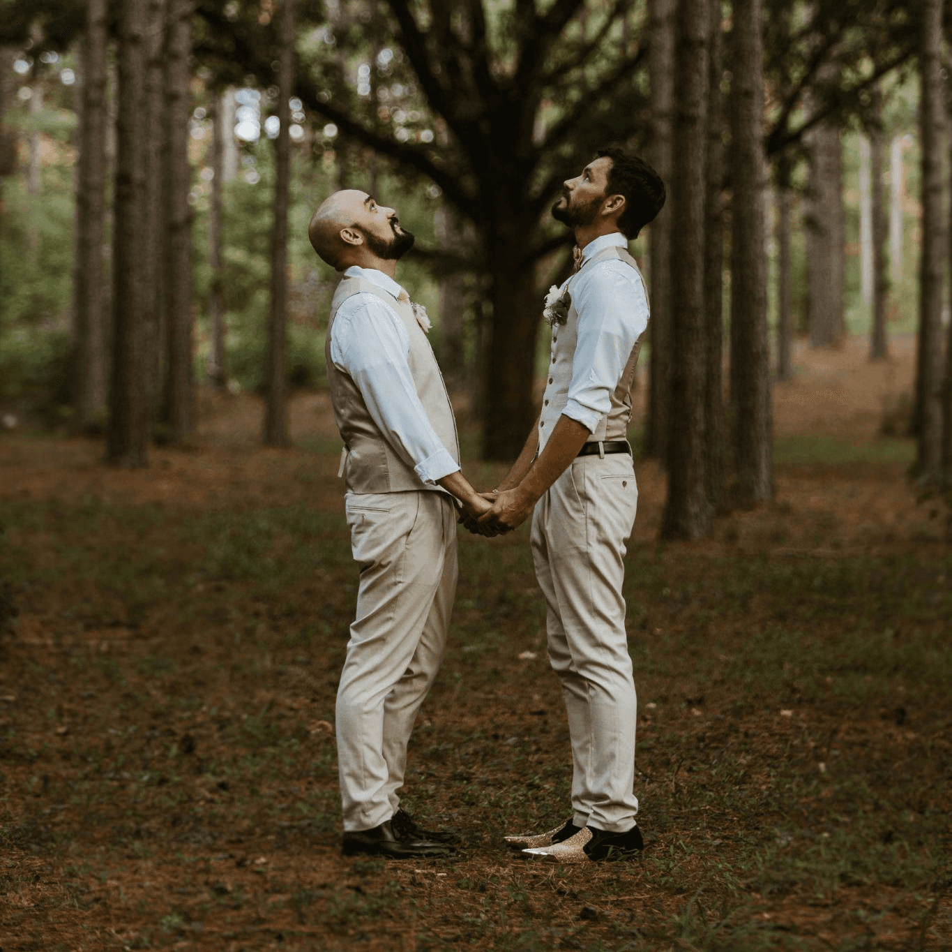 “Just married, two men stare up into the woodland canopy hand in hand.”