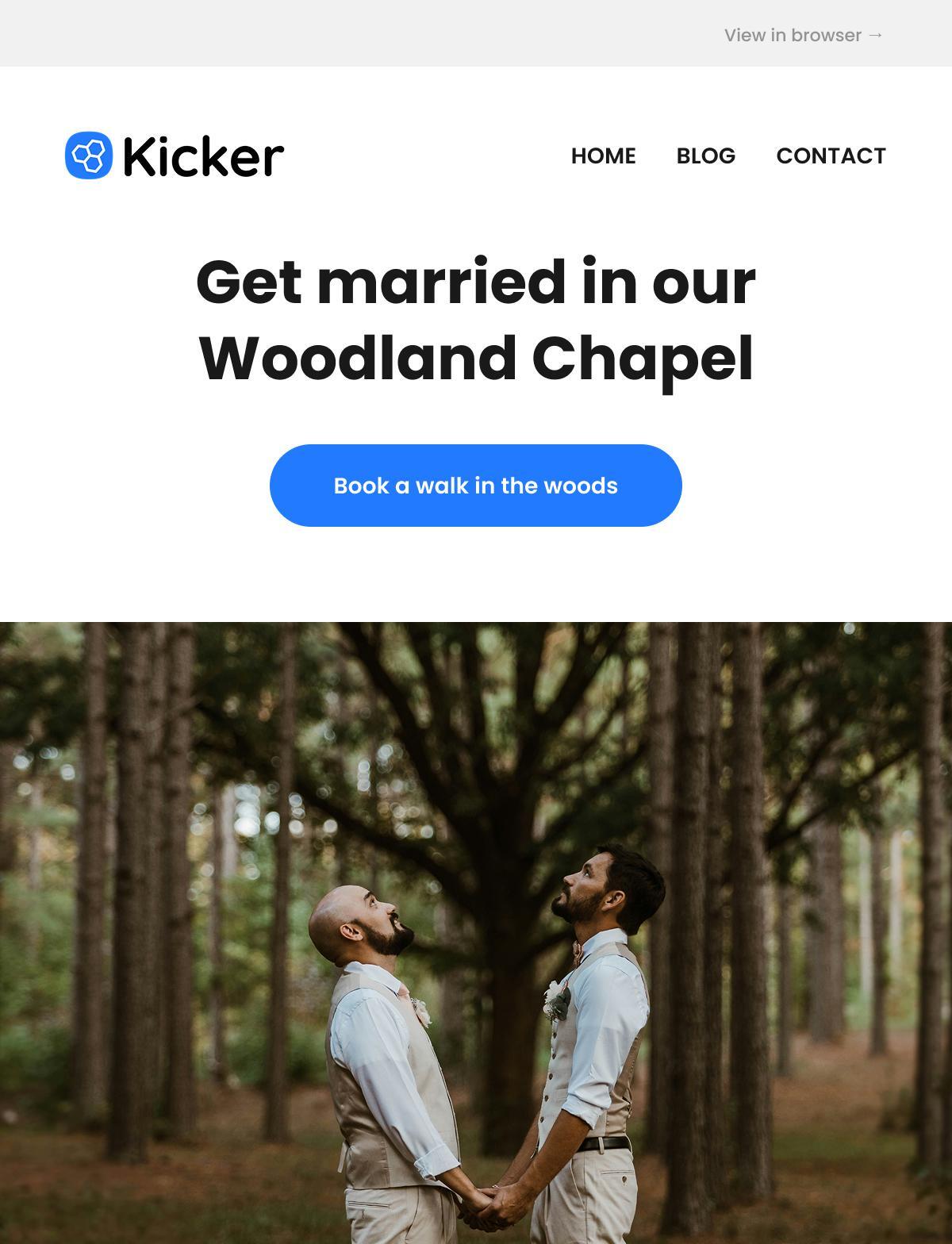 The alt text describes the image in a way that fits the email’s context. It’s all about selling the woodland as a beautiful place to get married. So there’s no need to talk about what the couple is wearing, their positions, or the fact that they are both male.