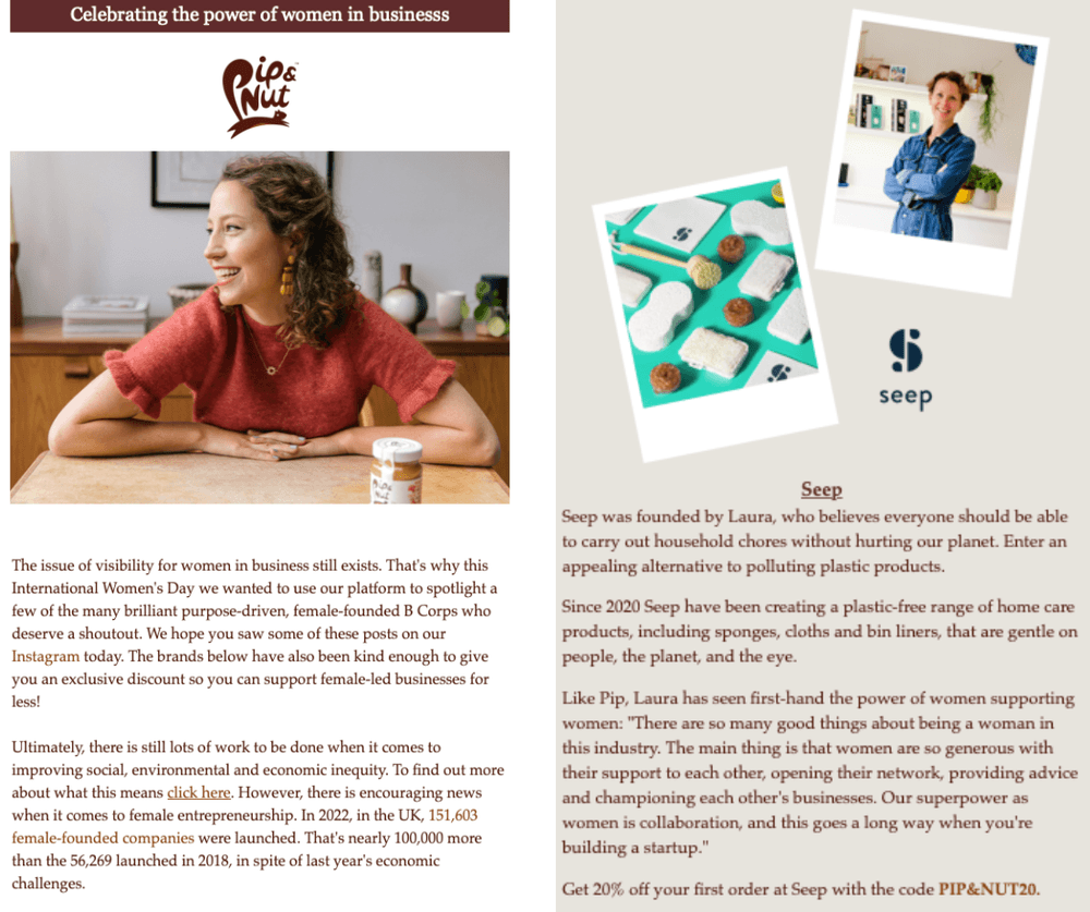 Pip & Nut hit the mark by using their platform to shout out fellow purpose-driven female-founded Bcorps without a single attempt at pushing their own product, plus they offered discounts to use with those brands. The copy is informative without losing their usual friendly, informal tone of voice and they address the problems women face in business whilst remaining positive about the future of female entrepreneurship.