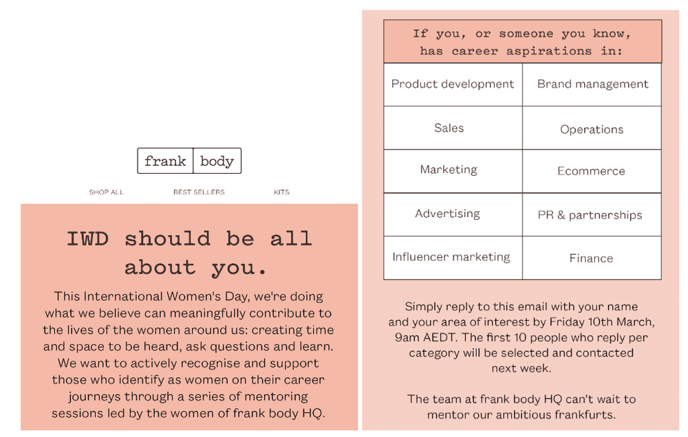 Carrying on the theme of uplifting female entrepreneurs, frank body took the novel initiative of offering mentoring sessions led by the women of their HQ. You just had to reply to the email and the first 10 people to do so per category were chosen. Effective and impressive, especially considering this year’s IWD theme of #EmbraceEquity.