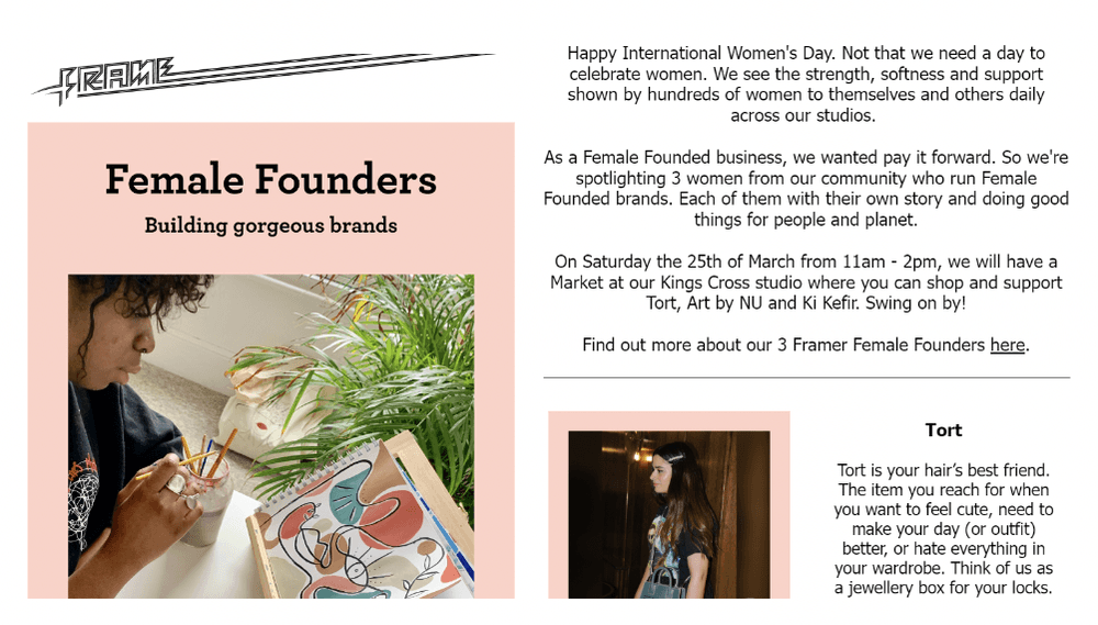 Frame put their fellow female-founded businesses within their own community forward in their IWD email, which feels particularly thoughtful as they are all small brands. We also like how they’ve not been afraid to celebrate women for softness and support in their copy, a nice touch from a fitness company when many of those often mainly shout about being strong and tough.