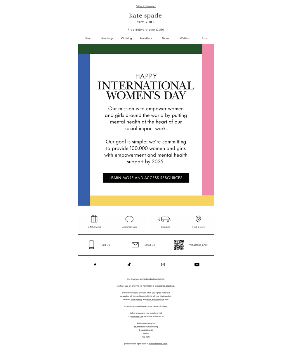 It does seem, however, that many brands overlook the global element of IWD. So it was great to see Kate Spade shout about their social impact work, through which they aim to provide 100,000 women and girls around the word with empowerment and mental health support by 2025. Using a simple hero-only email with the CTA directing to a landing page full of information and mental health resources, this one really stood out.