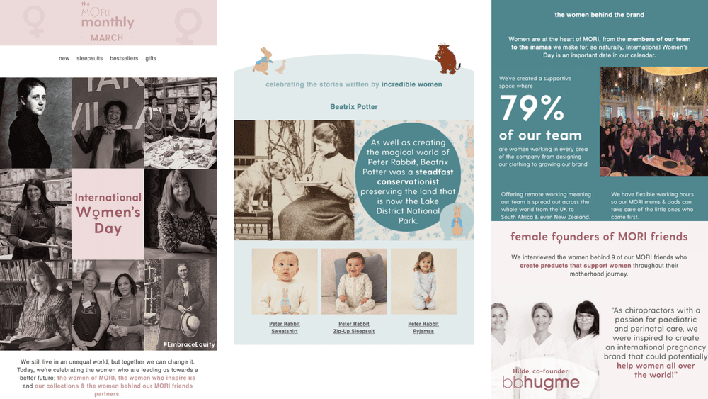 Childrenswear brand MORI had a nice approach in their email with a focus on female business founders, as well as championing the women behind their brand. We loved this, and perhaps it would have been even better if those messages had been above the product-push in the secondary content.