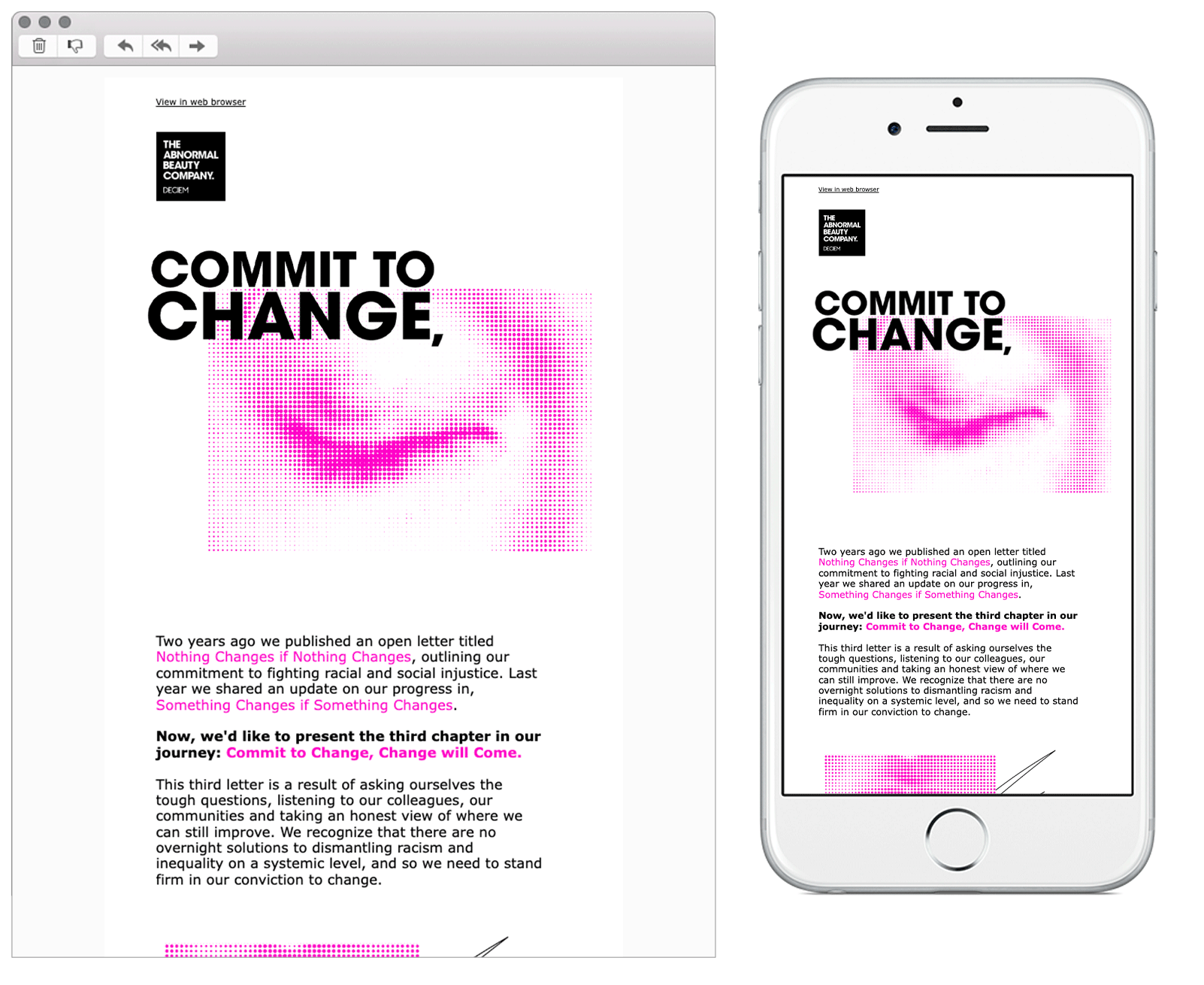 An inspirational email here from Deciem, we always value the brands who practice what they preach and follow through with actions. Two years ago Deciem committed to help fight racial and social injustice, and this email is a nice update to their customers on their journey and current status.