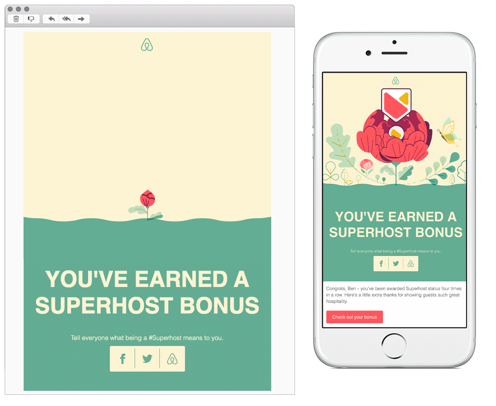 This email was sent to Superhosts, with a purpose of congratulating their hosting journey so far. Air Bnb pulled out personalised data on the hosts to add valuable content giving them a morale boost. We love how clear this data is displayed, and the use of icons is a great way of creating a sense of reward and community achievement.