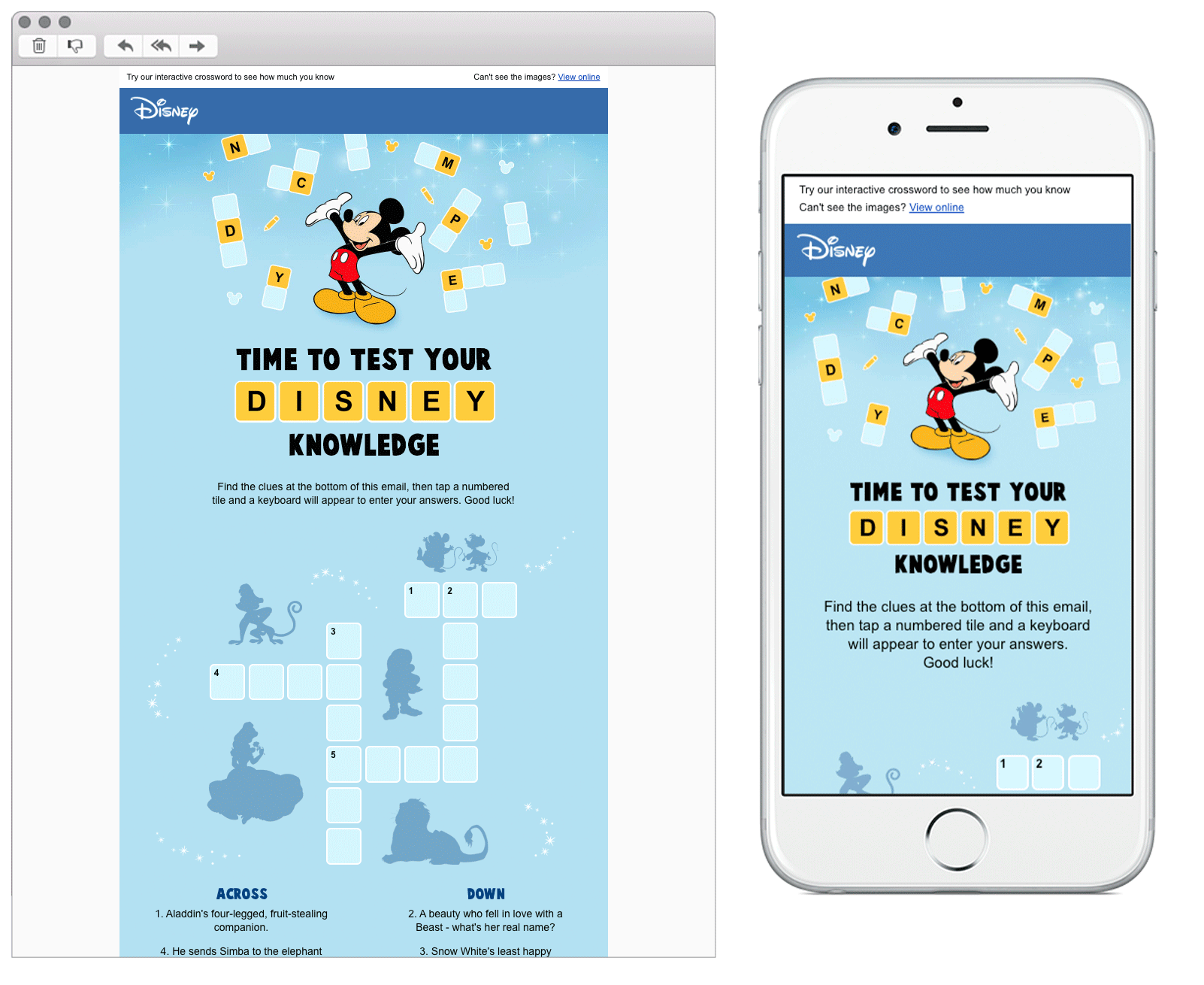 A fun email from Disney with the use of an interactive crossword for recipients to complete and enjoy. The crossword is clear and the copy is minimal but still understandable. We also love how if a user needs a little extra helping hand they can click the instructions CTA to reveal a little more information.