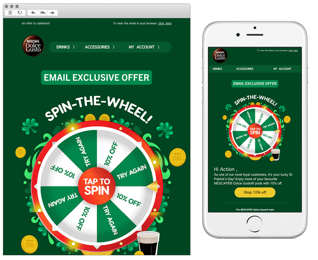 Design. This St. Patricks Day at ActionRocket, we wanted to help our client Dolce Gusto disrupt the inbox for their customers. We created a ‘spin to win’ interactive module to lead the email, asking the reader to take part to reveal their exclusive offer. We themed the email throughout making it stand out as much as possible, even adding in a Guinness-style coffee!