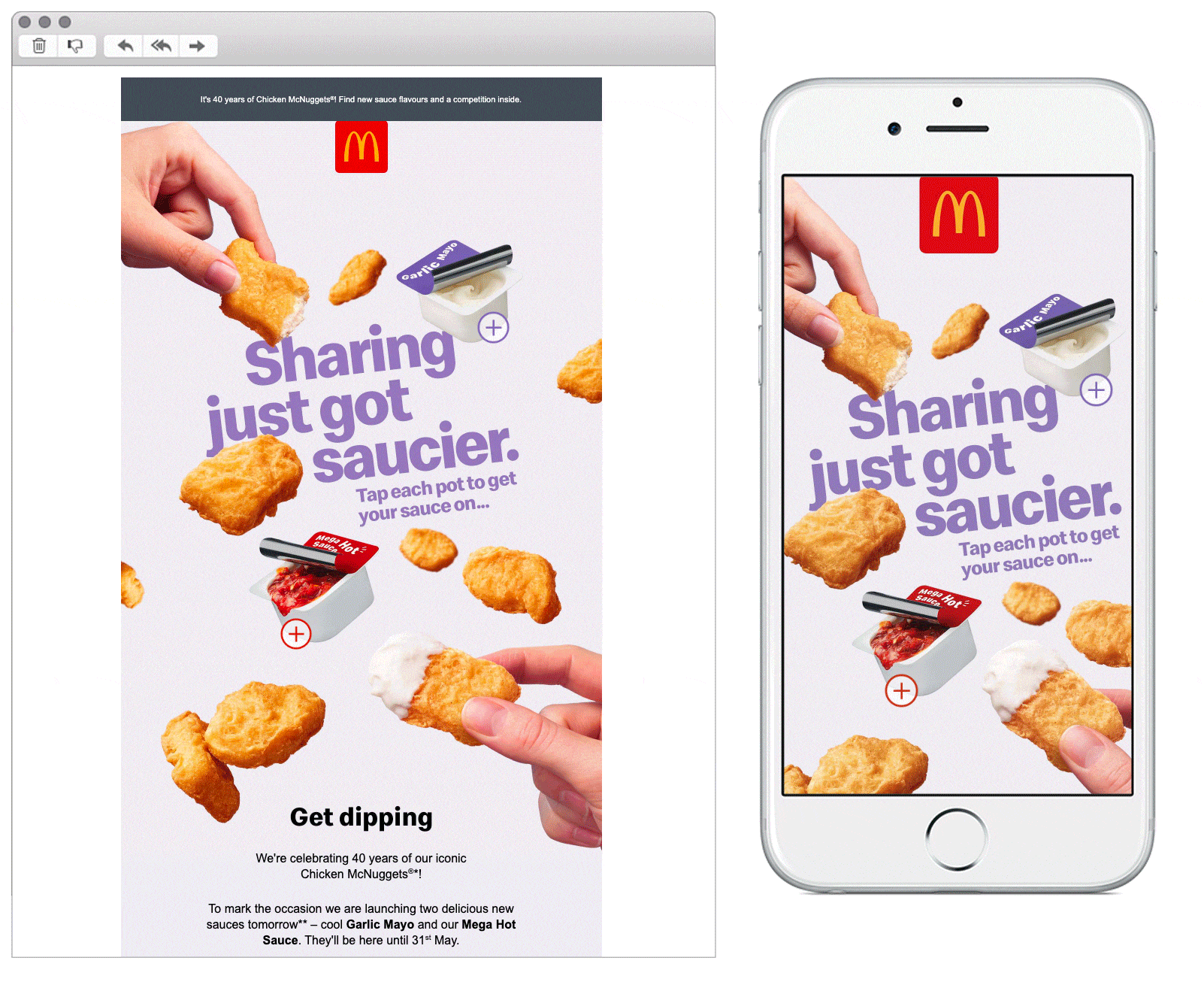 The interactive design invites us to tap on the pots and find out more about McDonalds’ new sauces. It’s effective, simple and certainly makes us want to have a dip! The copy has a fun, celebratory tone which raises excitement for their big occasion: 40 years of Chicken McNuggets.