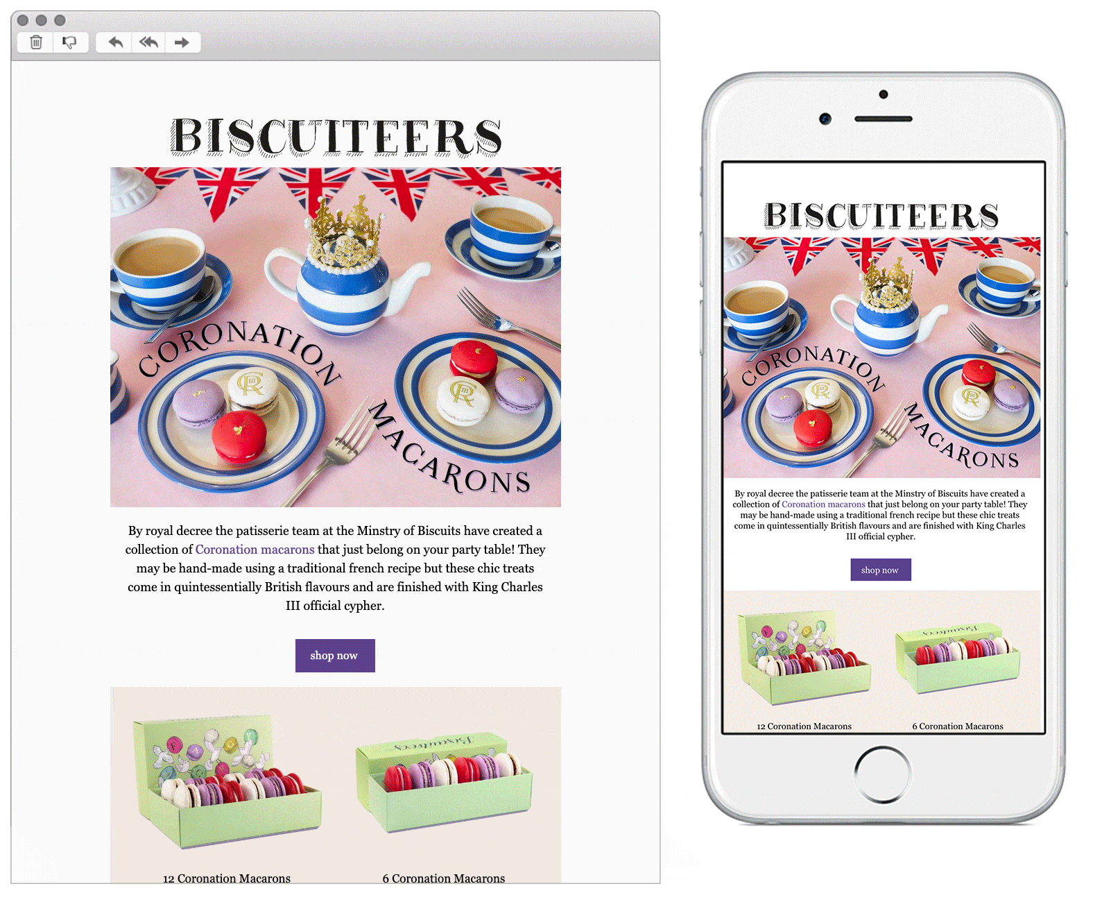 Biscuiteers are doing a regal job of promoting their delectable-looking Coronation themed macarons this month. The gorgeous product photography in the hero succeeds to make the reader feel inspired for their tea party table to look as beautiful as the image. The animation in the secondary module displays the designs of the macarons perfectly and in an eye-catching way, plus the van traveling along the email’s footer is very cute.