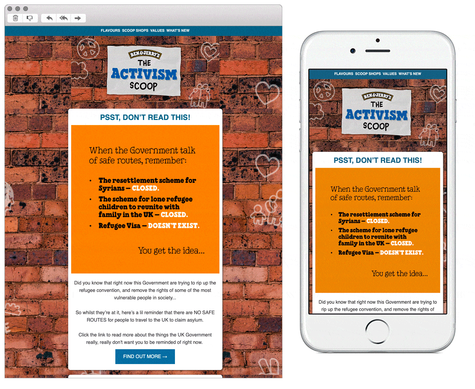 How refreshing (bad ice cream pun intended) to open a brand’s newsletter that’s dedicated only to raising awareness and calling for action about an important and timely topic. It’s impressive that Ben & Jerry’s don’t push their product once in the email, but not only that; the content is also brave. Not all of their audience will agree with their stance on this often contentious issue, so they risk losing a portion of their consumer base. Despite this, they’re using their position to influence change and in providing an easy way to take action it invites the reader to become more involved in the cause. Bravo Ben, bravo Jerry.