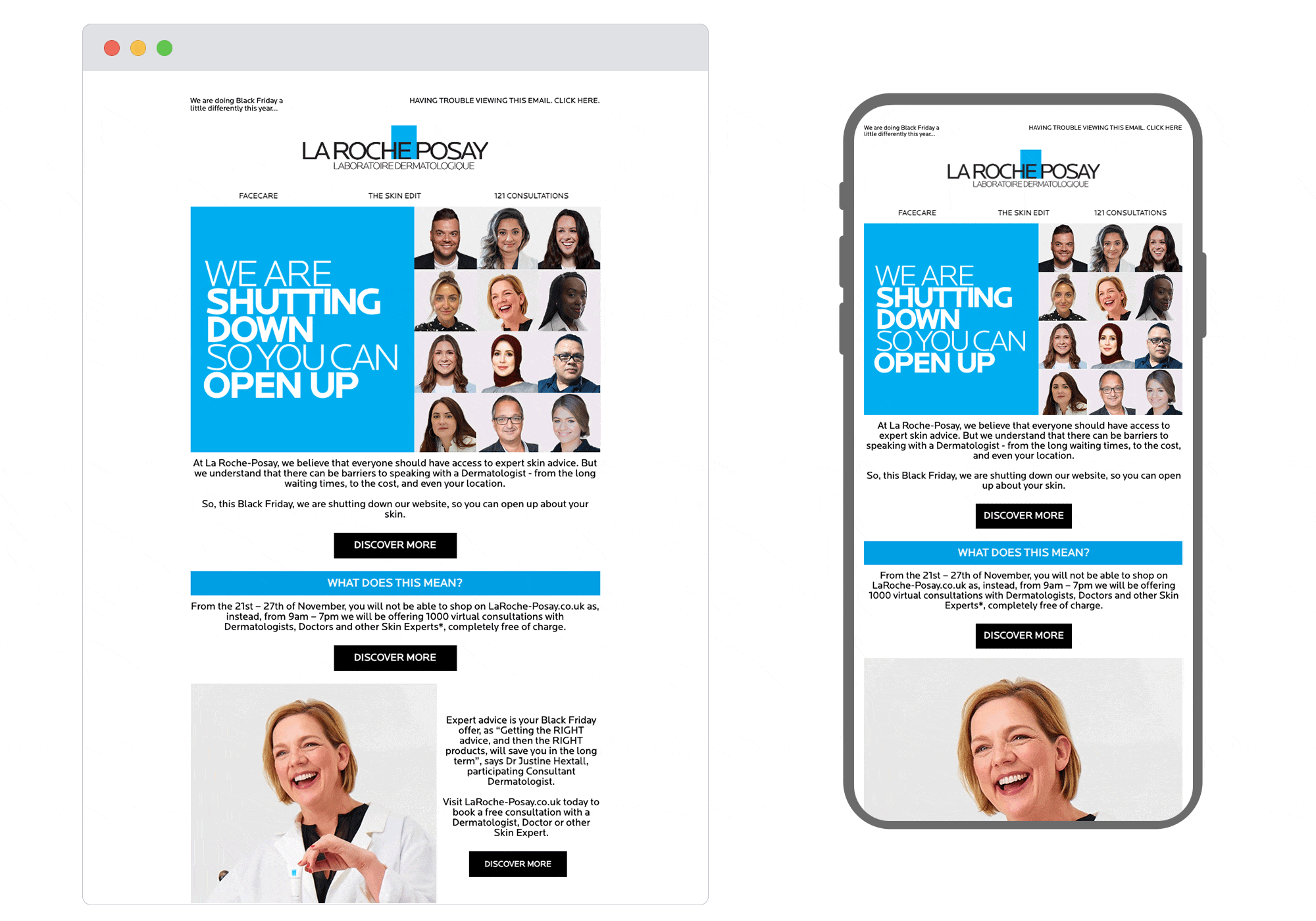 Of course Black Friday was going to pop up at some point! But, plot twist…we’ve selected this email from La Roche-Posay for its novel approach to the event. They chose to close their website down entirely so they could offer free skin consultations all week long. In doing so, they’re acknowledging that Dermatologist appointments aren’t accessible for everyone and addressing that by turning the sales element of Black Friday on its head. A brilliant display of inclusive marketing, and how to build trust from their consumers.