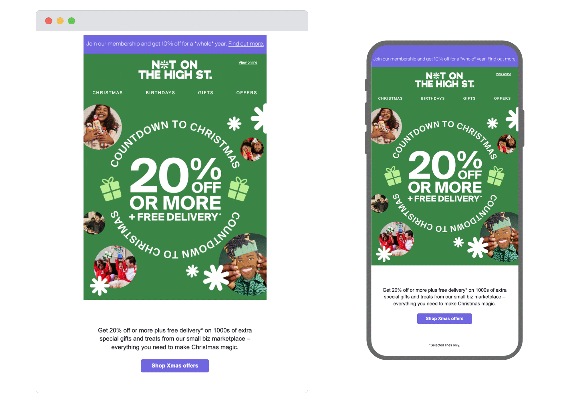 This email from Not On The High Street stood out amidst the pre-Christmas inbox influx for its combination of great design elements. We love the bright, bold colour palette that brings festive vibes in a refreshingly subtle way. The play on typography in the hero works well to draw attention to the messaging, linking the discount offer to the urgency of Christmas’ hasty approach. Using negative white space in balance with the CTAs also draws the eye effectively, and we love the fun roundel stickers highlighting their products' USPs.