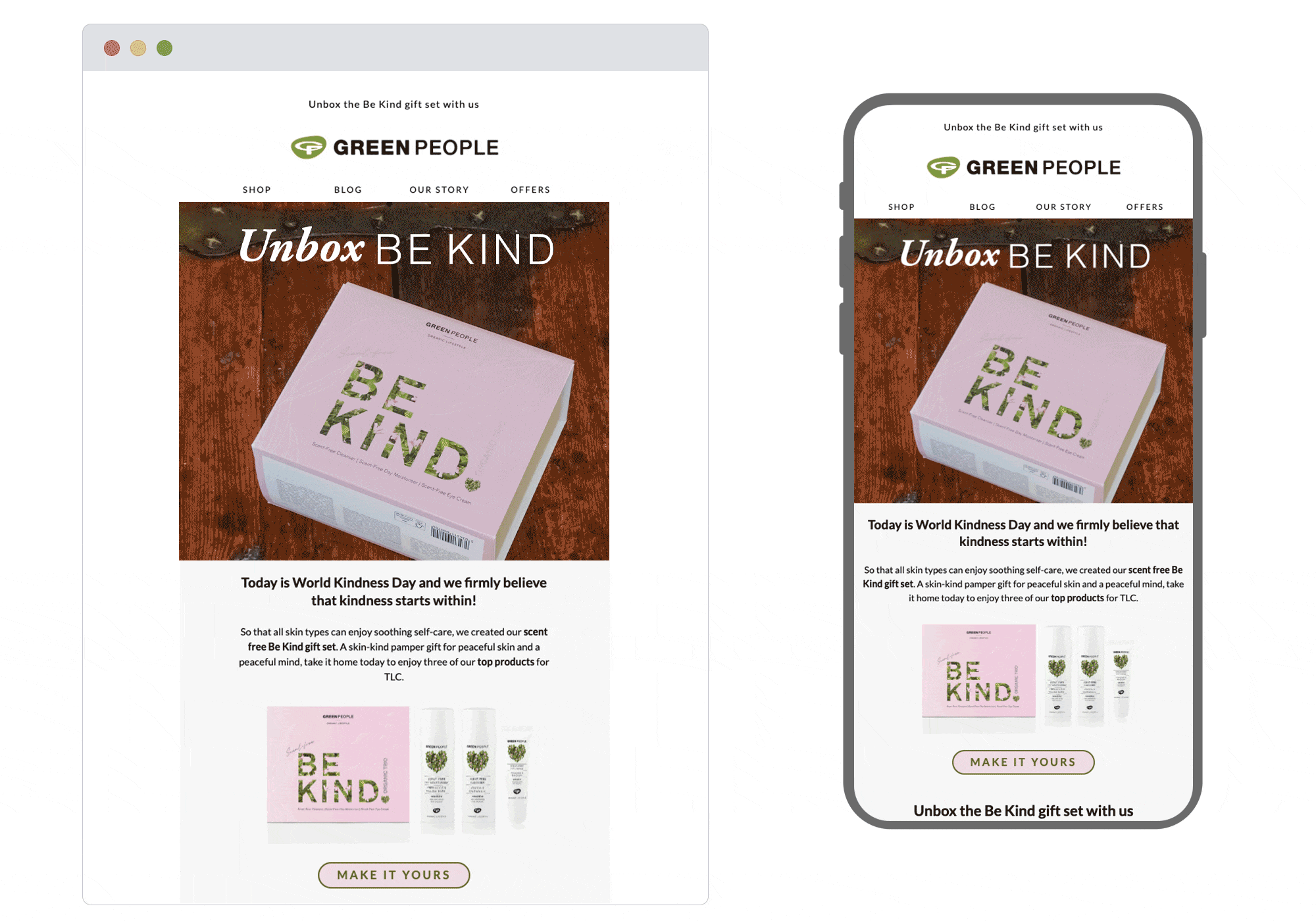 Another brand repping World Kindness Day - we love to see it! The way the colour palette complements the product packaging is extremely pleasing and makes the CTAs really stand out. We love how Green People have used the ‘unboxing’ trend to reveal their gift set, and the inclusion of a customer’s review quote at the end is good use of user-generated-content to strengthen the product even further.