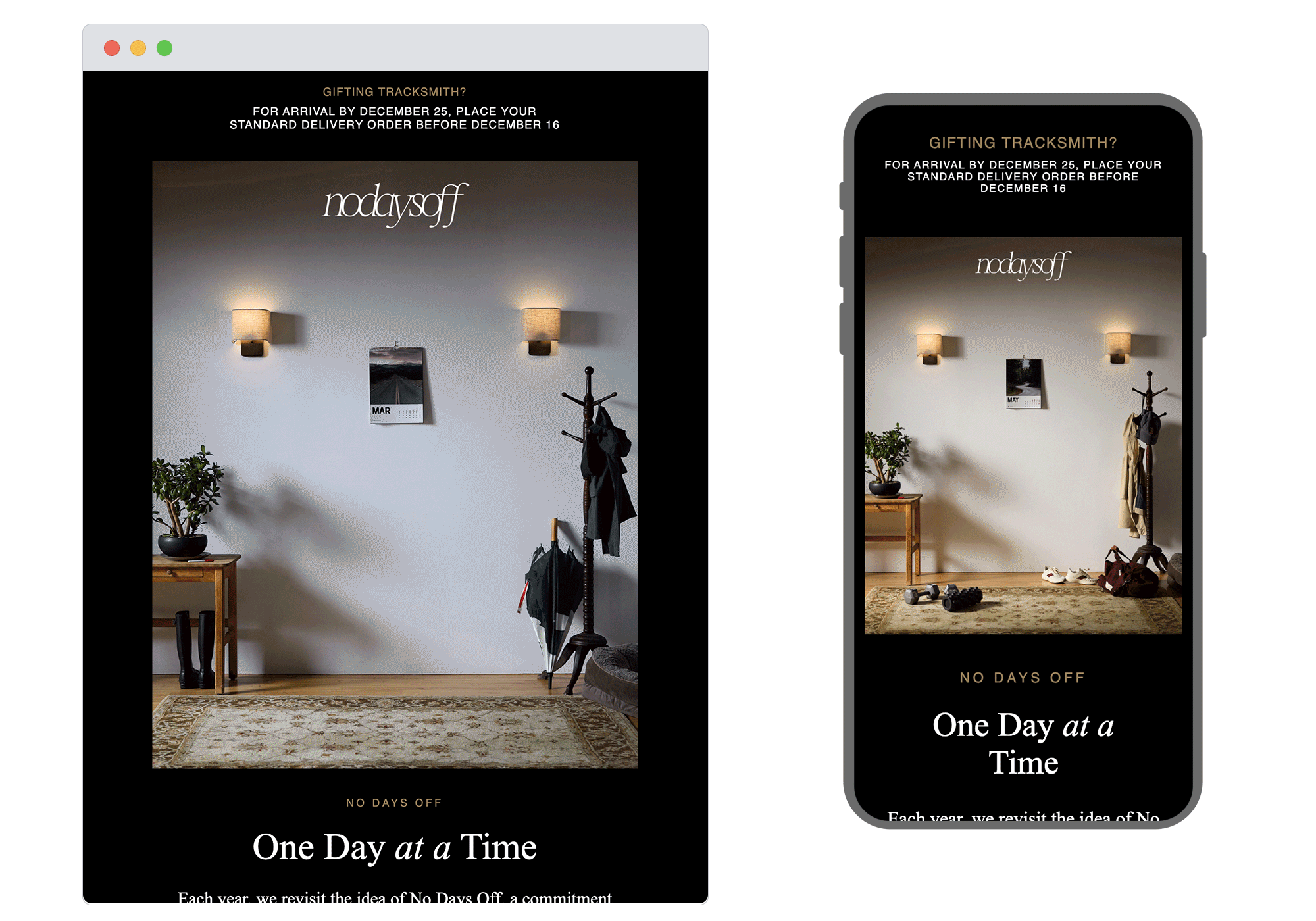Tracksmith’s email is a masterclass in storytelling, tapping into themes of preparation and perseverance for the year ahead. The hero GIF is subtle yet impactful, catching the reader’s eye without overwhelming the message. It perfectly aligns with the brand’s athletic and community-driven ethos.