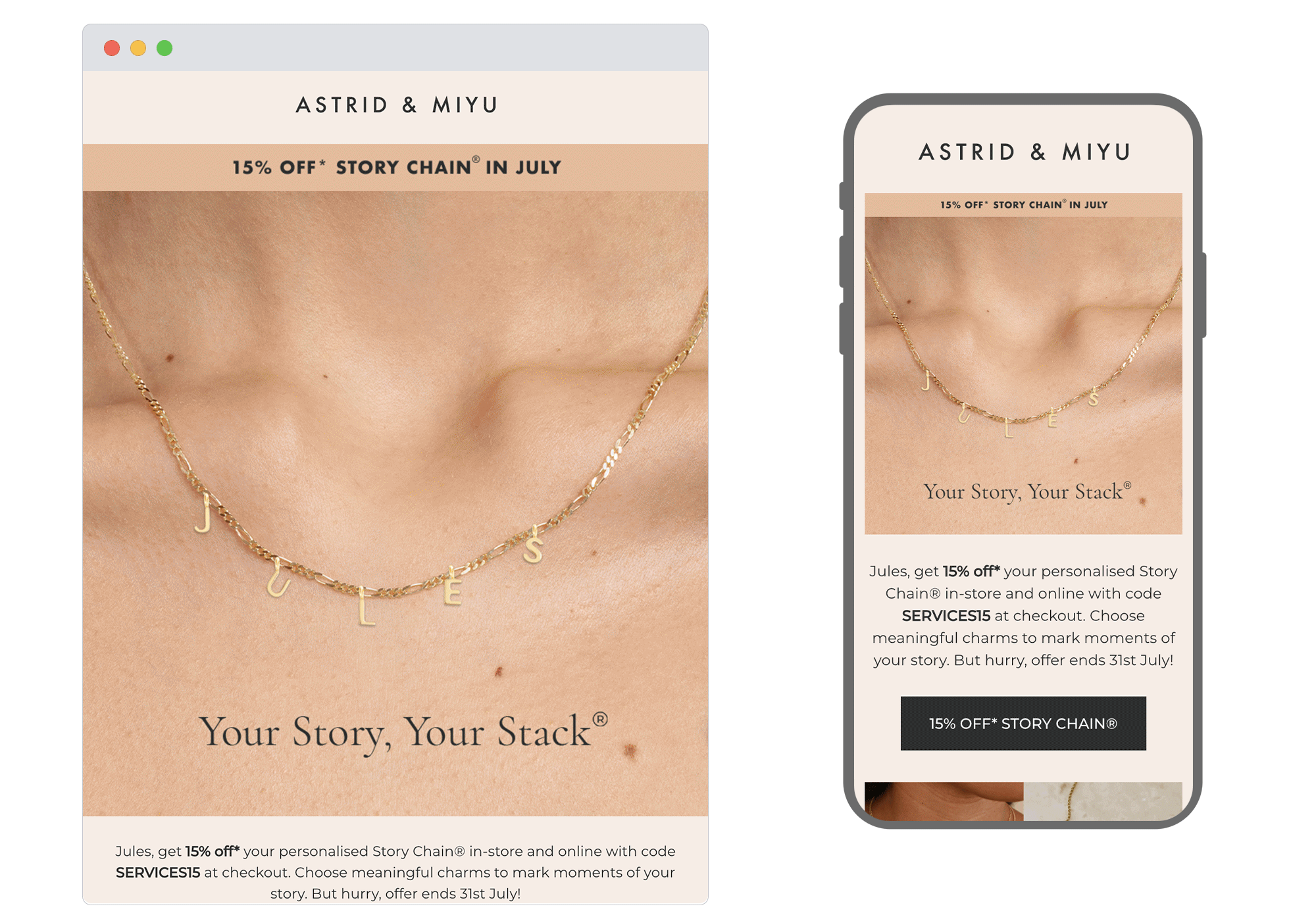 We did a double-take when we opened this email from Astrid & Miyu. The hero image featuring the recipient’s name on a pretty, delicate necklace is quite something, and with the entire thread being about tailor-making your own, it makes it stand out all the more. The question is… what is this sorcery?! Well, if you’d like to achieve similarly stunning personalisation in your emails, drop us a line and we’ll help make it happen.