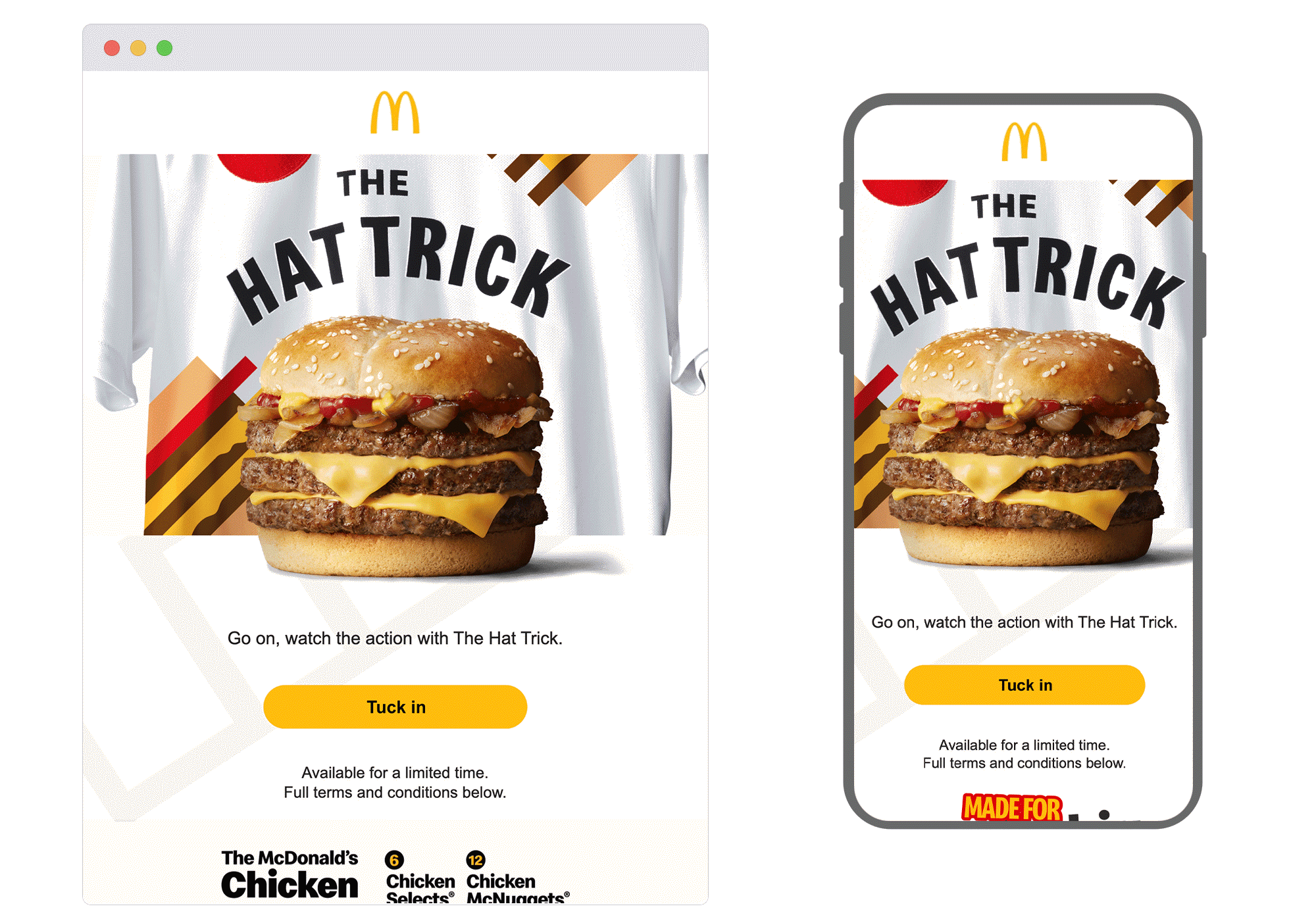 Remember the Euros final? The other big event in July, but one that united rather than divided the English nation. Sadly McDonald’s subject line was all too accurate so they did well to avoid the full IT’S COMING HOME messaging, but rather balance it nicely with the fact that watching the match with one of their meals is the only dead cert. And we love the shirt design that mimics the burger in the hero. Back of the net!