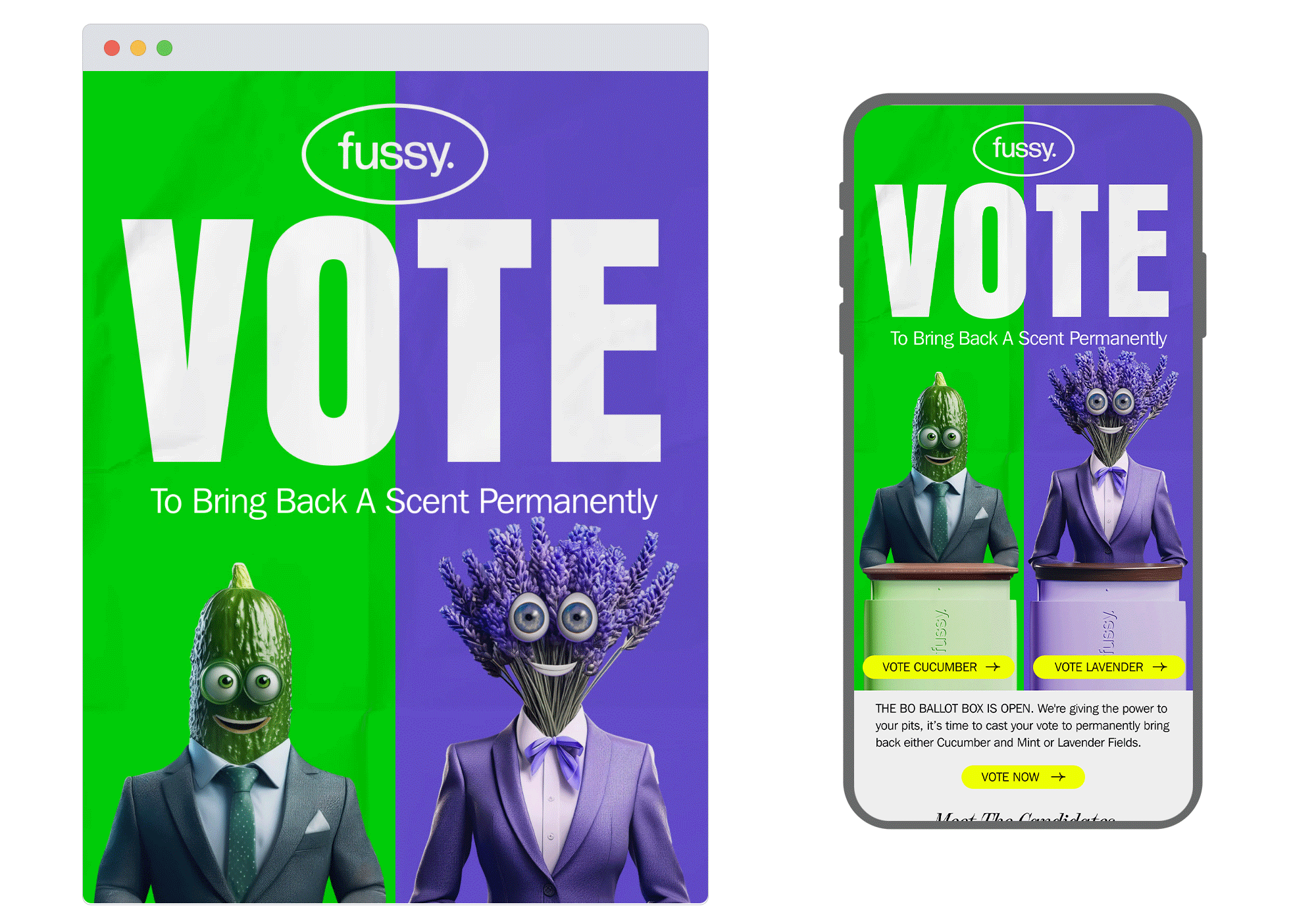 This email landed in our inboxes the day before the general election, bringing a welcome, lighthearted take on the big event. The hilarious graphics feature zany characters and the Fussy deodorant case as the podiums. These, combined with the silly but clever copy, result in a brilliant candidate that definitely has our vote.