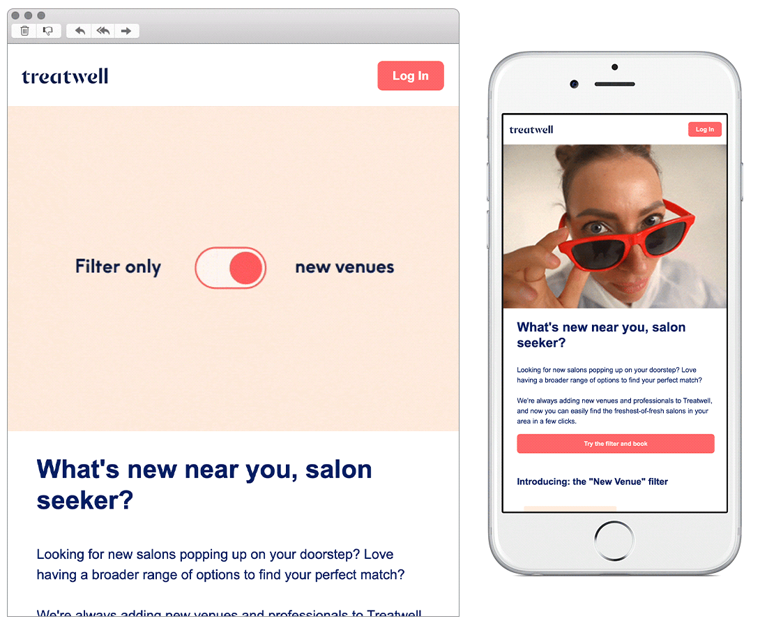 And here we have another fun, super-effective hero animation! The extreme close-up is certainly eye-catching, if a little disconcerting. It draws attention to a slick demo of Treatwell’s new filter tool which, in reality, is a little different to the mechanism on their website. But visually, it showcases it beautifully.