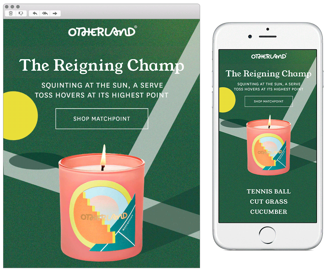 Tennis season is upon us and will ramp up as the summer rolls in. We love the slightly retro design of this email from Otherland, which features their ‘Matchpoint’ candle. The product’s bright colours stand out against the tennis court’s darker hues, and the shadows falling from the candlelight are a nice touch. A flickering after-effect would have made it a Grand Slam!