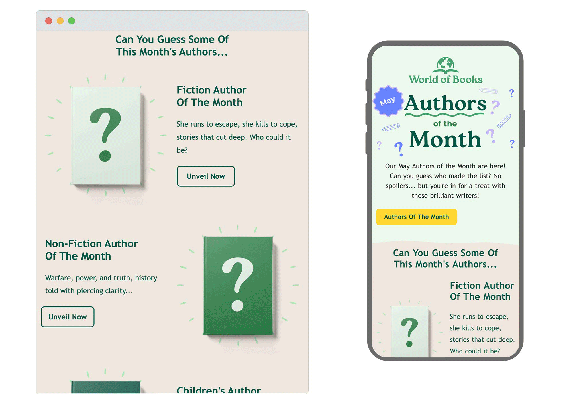 Gamified design meets curious charm in this clever campaign from World of Books. Instead of reeling off author names, it lures with a quiz-style tease that drives just enough intrigue to encourage a click through. We also love the clear layout that seamlessly guides the eye down to the well-placed ‘download the app’ CTA.