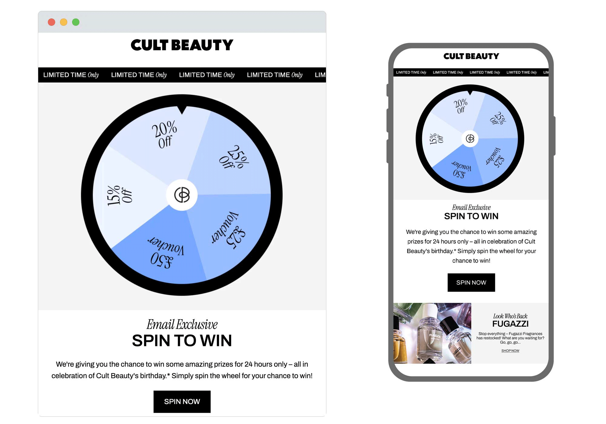 To celebrate their birthday, Cult Beauty kept things sleek with a minimalist spinner. The design is sophisticated, with a unified colour palette and a no-frills approach to interactivity that still draws you in. Spin-based gamification in CRM isn’t new, but when it’s done with flair, we’ll happily give it a whirl.