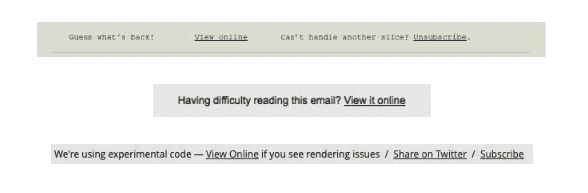 All of the links above show the same email HTML but rendered in your chosen browser. A lot of Email Service Providers (ESPs) have this as a feature and they can be included with a short piece of personalisation. But why are they there?