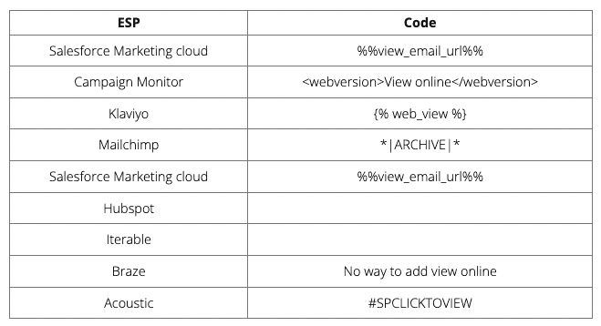 In most ESP editors there is a way to add a merge tag or personalisation tag to include a view online version. If your ESP doesn’t provide it, you can always ask them and see if it is on their roadmap, but another option is to host your emails on your website, server or at a specific link.