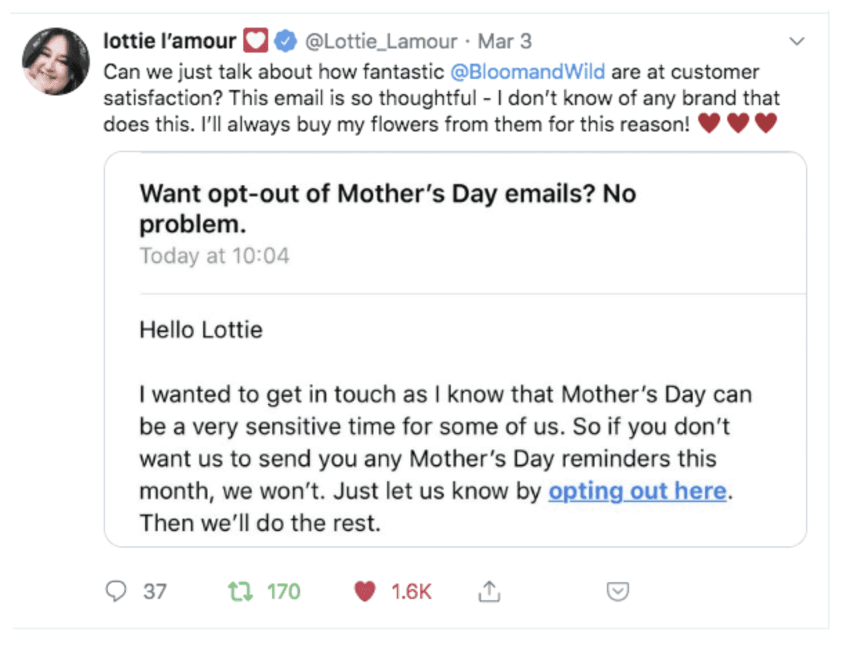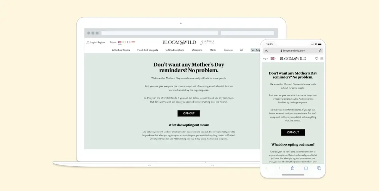 Bloom & Wild has gained a reputation for genuinely listening to its customers, becoming one of the first brands in its sector to offer ‘opt-out’ communications for sensitive occasions throughout the year. In 2019, it introduced this option ahead of Mother's Day, allowing recipients to choose more general emails that featured the same offers but avoided potentially triggering messaging.